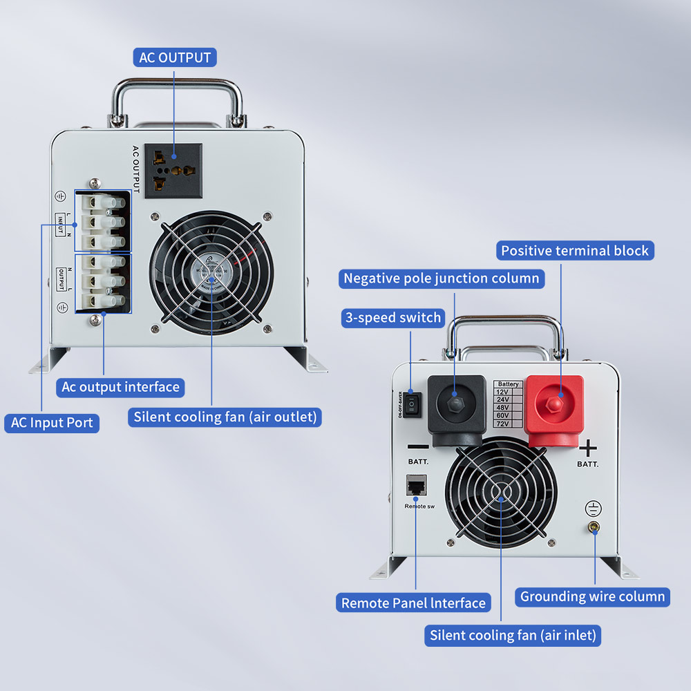 ● 4KW 5KW 6KW 7KW 8KW इंडस्ट्रियल फ्रीक्वेंसी इन्वर्टर: 7 वर्किंग मोड, मेन्स \ सोलर \ एनर्जी-सेविंग मोड में, सभी अप्राप्य, जनरेटर, बैकलाइट और आउटपुट मोड के साथ समायोज्य होने पर समायोज्य; नई स्थिति डिस्प्ले बार, सेल्फ-चेक फॉल्ट, रिस्टार्ट फ़ंक्शन;